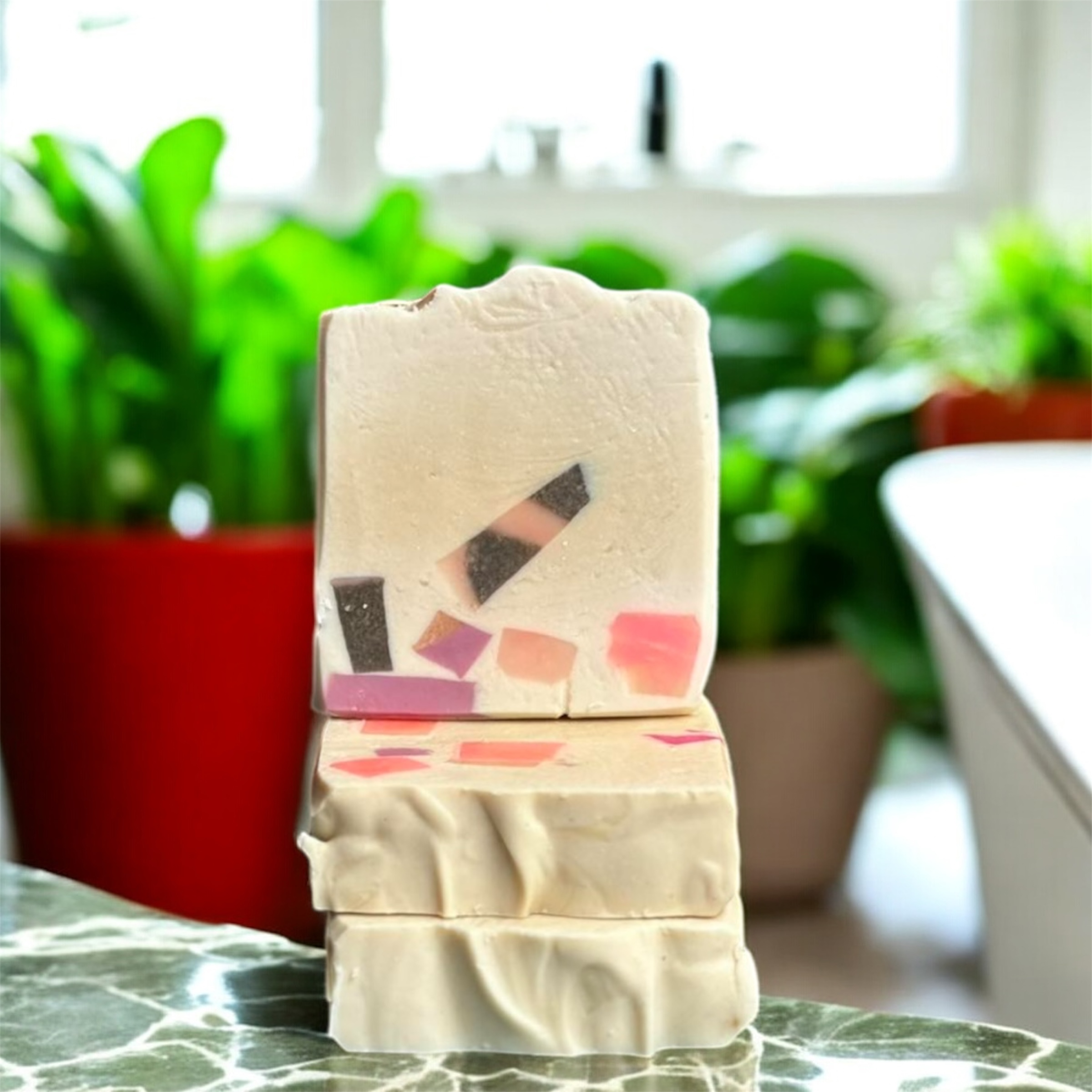 Ingredients: Raw goats milk (40%), Saponified oils of Olive, Coconut, Rice Barn, Sunflower, Macadamia, Avocado, Sodium Hydroxide, fragrance, Mica Powder.
