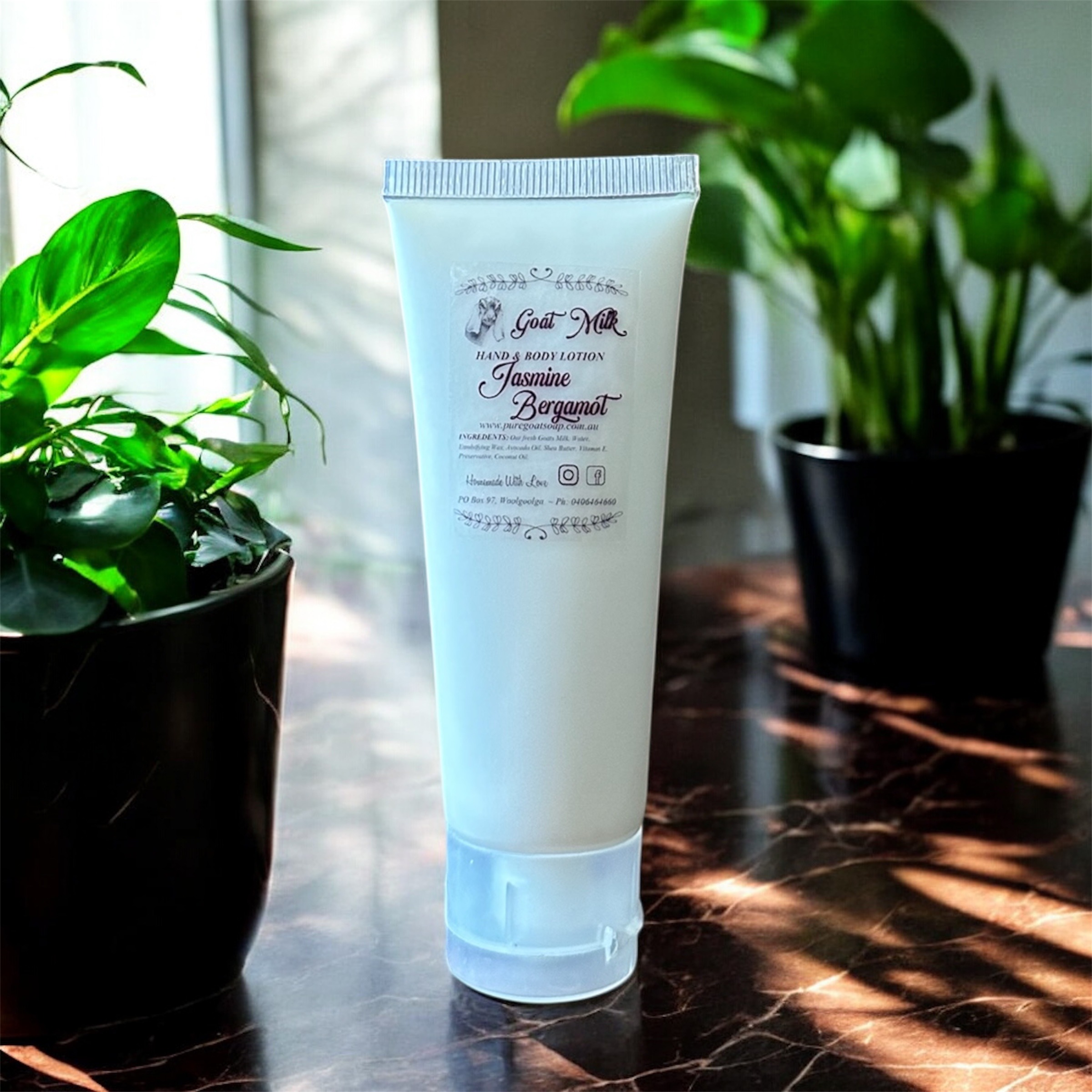 Handmade goat lotion. This lotion is lightly scented with jasmine bergamot fragrance and comes in 50ml & 150ml bottles