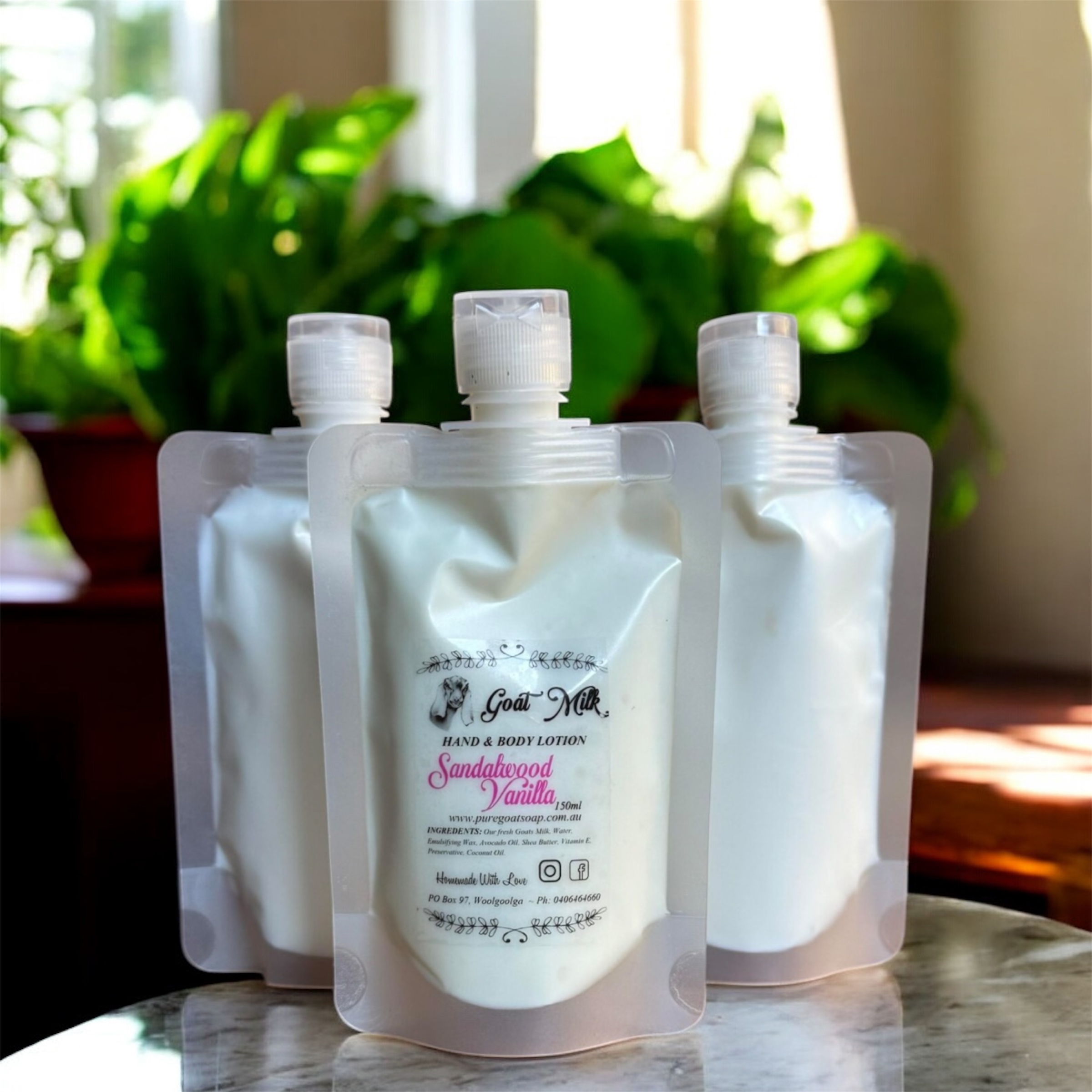 Handmade goat lotion. This lotion is fragranced with sandalwood vanilla and comes in 50ml & 150ml bottles